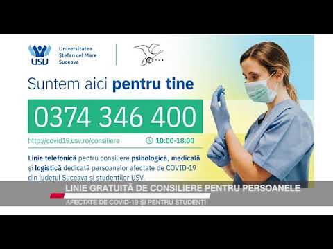 O linie telefonică de consiliere psihologică, medicală și logistică pentru persoanele afectate de COVID-19 din județul Suceava și pentru studenții USV este disponibilă între orele 10-18. Linia a fost dechisă de voluntari de la USV și Asociația Cygnus Suceava, iar consilierea este gratuită.