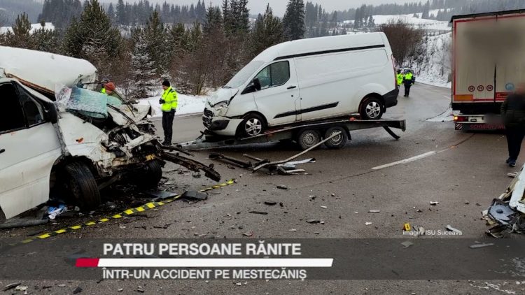 Patru persoane au fost rănite marți dimineață, într-un accident produs pe DN17, în Pasul Mestecăniș. Cei patru răniți se aflau într-un microbuz care a intrat în coliziune cu un camion. Două dintre victime au rămas încarcerate și au fost extrase de pompierii militari. Pe durata intervenției echipajelor de salvatori, traficul rutier s-a desfășurat cu dificultate.