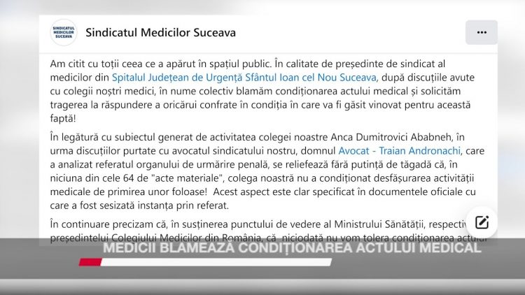 Sindicatul Medicilor Suceava a reacționat după arestarea preventivă pentru 30 de zile a medicului oncolog de la Spitalul Județean „Sf. Ioan cel Nou” cercetat pentru luare de mită în formă continuată. Medicii susțin că s-au consultat cu un avocat de la care ar fi aflat că doctorul anchetat penal nu ar fi condiționat actul medical.