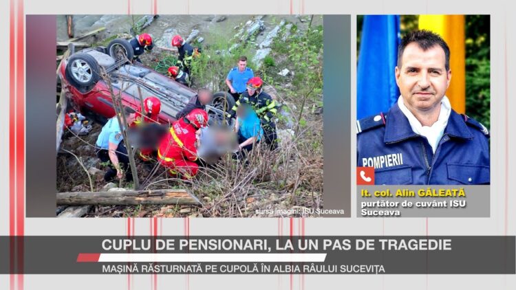 Doi pensionari din Rădăuți au scăpat ca prin urechile acului după ce mașina în care se aflau a căzut de pe un podeț șubred, direct în albia râului Sucevița. Autoturismul s-a răsturnat pe cupolă, iar cei doi – un bărbat de 79 de ani și soția sa de 78 – au rămas blocați în interior. Pompierii au intervenit rapid pentru extragerea victimelor, care erau conștiente și cooperante. Cei doi au fost transportați la spital pentru investigații medicale.