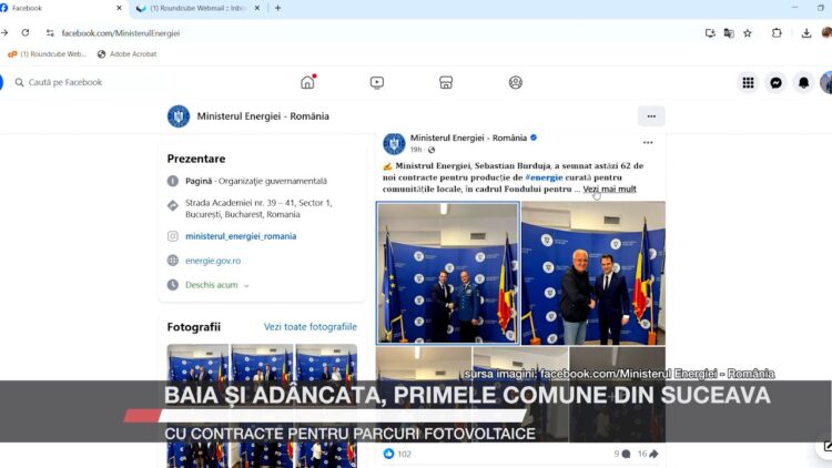 Comunele Baia și Adâncata sunt primele din județul Suceava care au semnat contracte de finanțare pentru construirea de parcuri fotovoltaice destinate autoconsumului instituțiilor publice. Evenimentul a avut loc miercuri, pe 14 mai 2025, la sediul Ministerului Energiei din București.