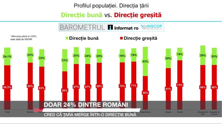 Pesimismul domină România. Doar 24% dintre români cred că țara noastră se îndreaptă într-o direcție bună, în timp ce 66,3% spun că România merge într-o direcție greșită. Datele apar în cel mai recent Barometru realizat între 25 octombrie și 2 noiembrie 2025, de INSCOP Research.