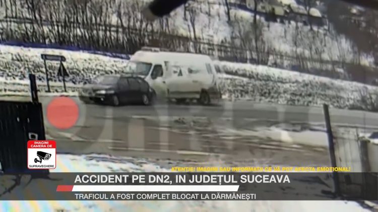 Traficul a fost blocat pe ambele sensuri pe DN2, în Dărmănești, județul Suceava după un accident în care au fost implicate două autotrenuri, un microbuz de transport marfă și un autoturism. Atenție! Urmează imagini care vă pot afecta emoțional. Impactul, surprins de o cameră de supraveghere, a impus intervenția echipajelor de salvare. O persoană din autoturism a rămas încarcerată și a fost extrasă de echipajele de intervenție, iar o altă persoană, din microbuzul de transport marfă, a fost și ea monitorizată medical. Ambele victime sunt conștiente și cooperante și au fost transportate la spital. Șoferii autotrenurilor nu au avut nevoie de îngrijiri medicale.