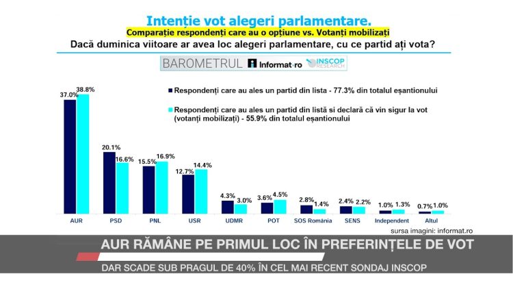 AUR rămâne primul partid în intenția de vot, dar pierde din susținere și coboară la 37%, potrivit celui mai recent sondaj realizat de INSCOP Research. Datele arată diferențe tot mai mari între preferințele declarate și mobilizarea reală la vot. În scenariul în care sunt luați în calcul doar alegătorii care declară că vor merge sigur la vot, raportul de forțe se schimbă ușor.