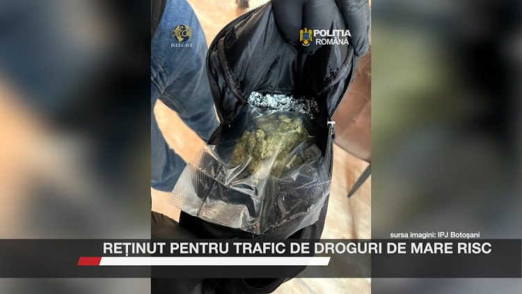 Un bărbat în vârstă de 35 de ani a fost reținut de procurorii DIICOT – Biroul Teritorial Botoșani, într-un dosar privind trafic de droguri de risc și de mare risc. La percheziții, oamenii legii au găsit în locuința acestuia peste 70 de grame de canabis, din care o parte era porționată în 20 de doze ambalate în folie de aluminiu. Totodată, au fost descoperite 33 de pachețele care conțineau aproximativ 24 de grame de NEP, substanță psihoactivă. Potrivit anchetatorilor, contactul cu clienții avea loc în zona unei săli de jocuri pe care bărbatul o frecventa. Acesta a fost prezentat magistraților Tribunalul Botoșani, cu propunere de arestare preventivă pentru 30 de zile.