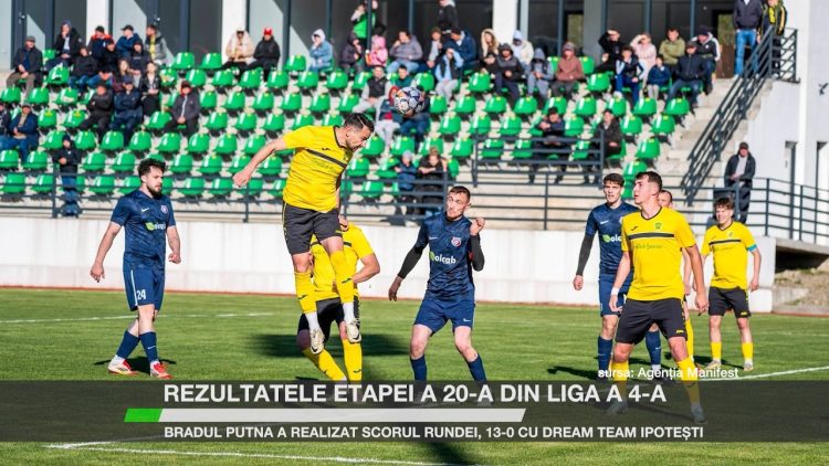 Etapa a 20-a din Liga a 4-a de fotbal a adus victorii categorice pentru echipele din fruntea clasamentului. Bradul Putna a realizat scorul rundei, 13-0 cu Dream Team Ipotești. Viitorul Fălticeni a învins Academica Gălănești cu 5-2, iar CS Vicovu de Sus a trecut cu 4-0 de Progresul Frătăuții Vechi.